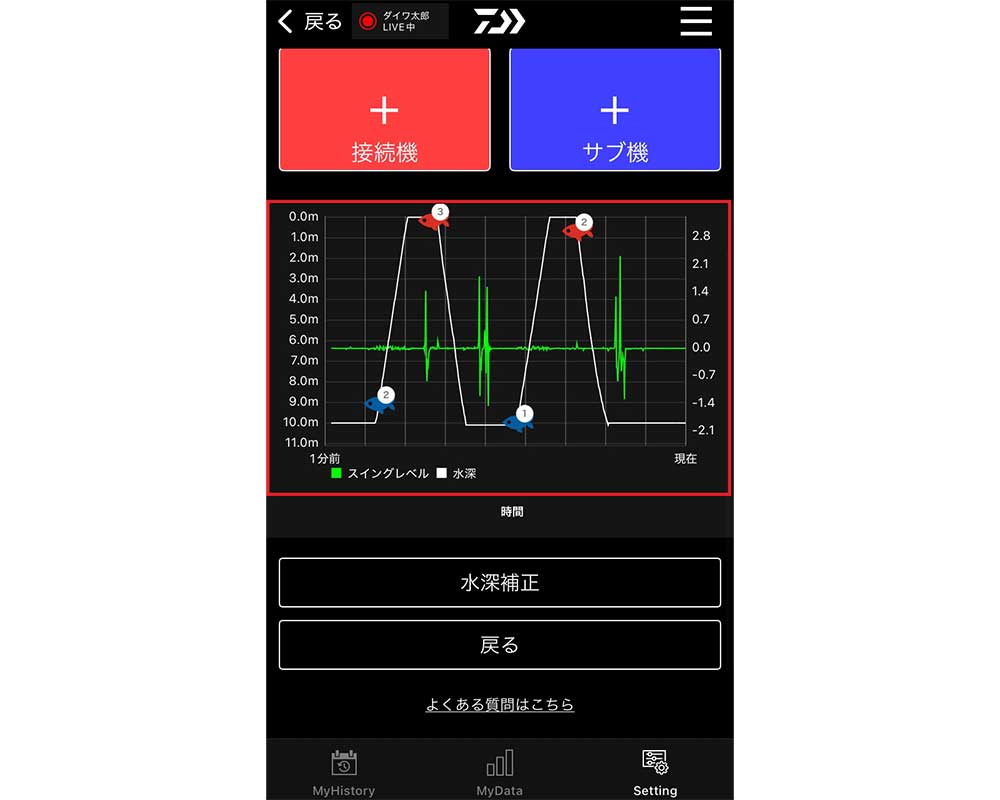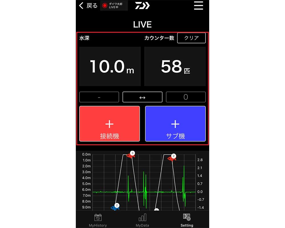 リールの水深カウンターはもちろん。さらに大きなのスマートフォン画面での確認で釣りの最中にさらに確認しやすい。フィッシュカウンター機能付きで、釣果を記録する事ができる。また、接続機とサブ機を分けて押すことで、それぞれの釣果記録は水深グラフに表記。