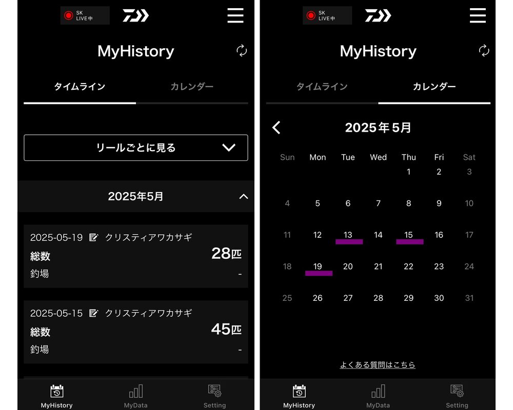 登録したリールで釣行日と釣果記録。また、確認したい日の釣行記録を見たい時にその日日付を選択すれば、釣行ログデータでの確認ができます。