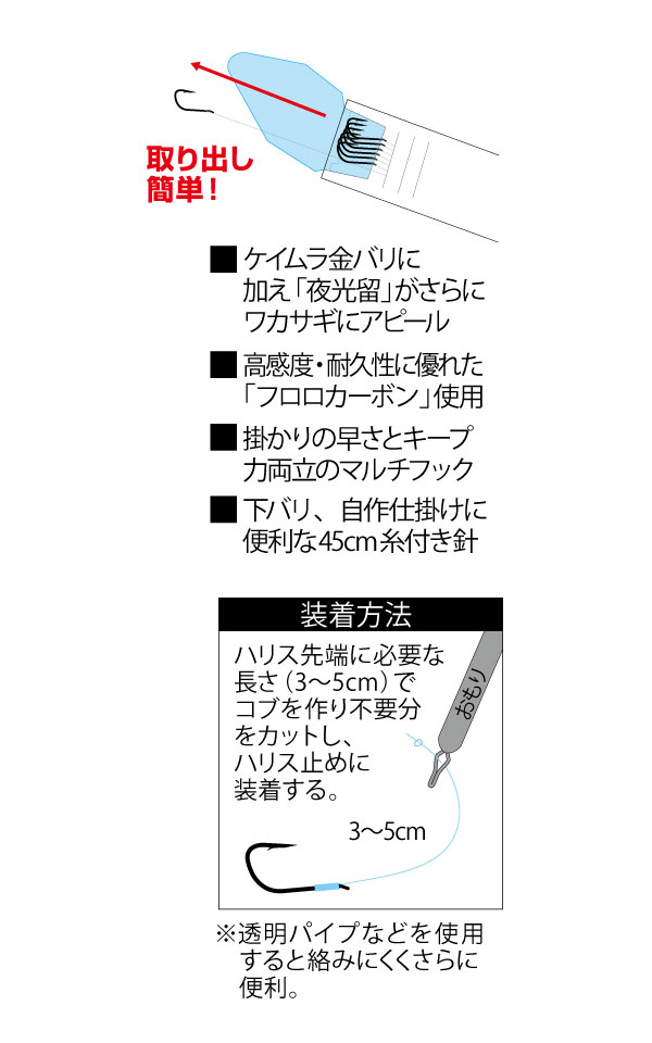 下バリ・オリジナル仕掛け作成に便利な45cmハリス付き。
