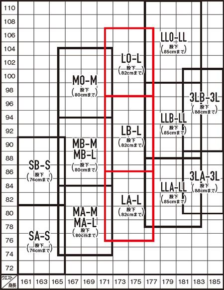 ※Oが付くサイズはウエストが大きめのサイズになります。(例:MO / LO / LLO)