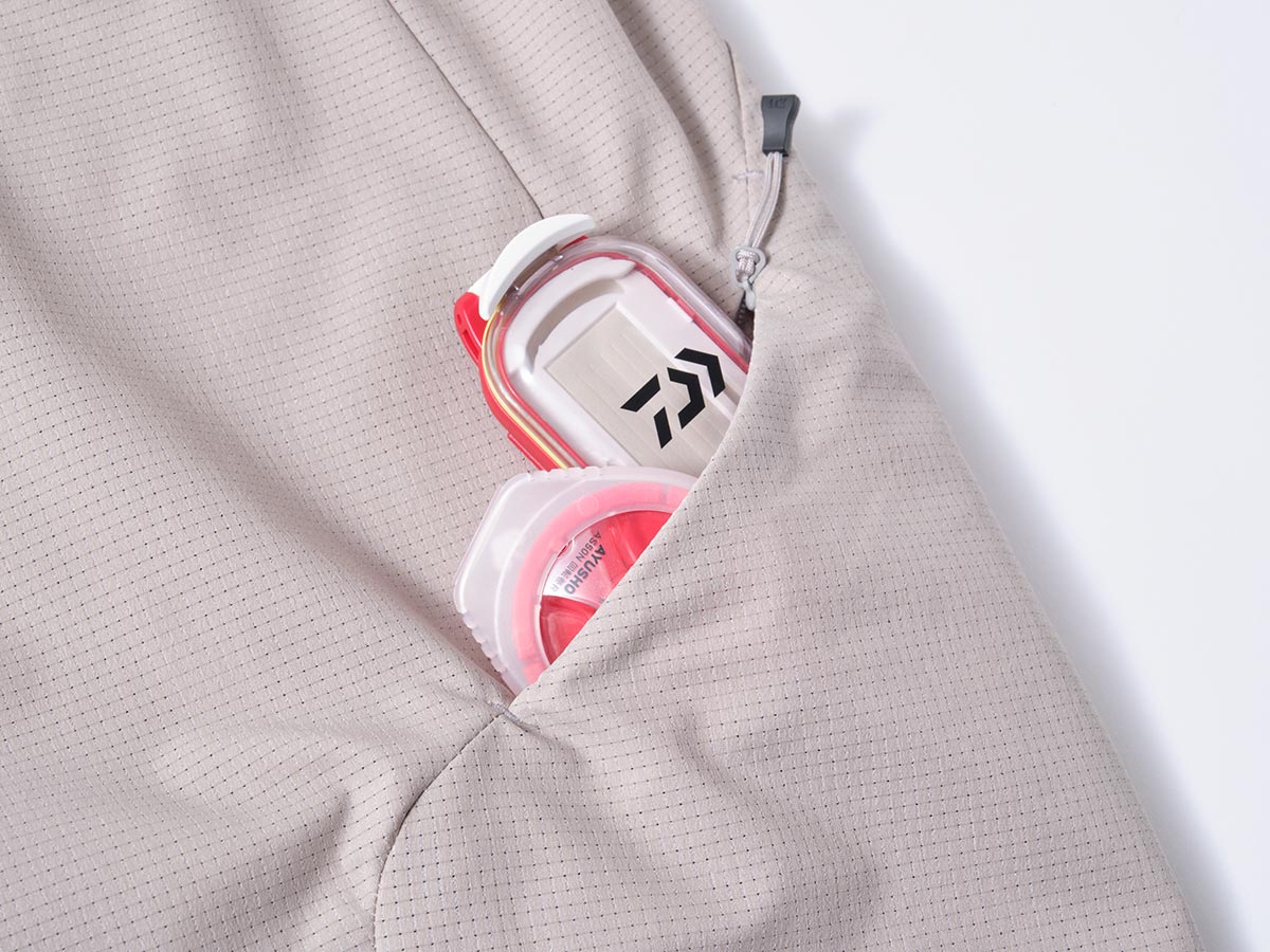 左右の太もも部分には、物を入れてしゃがんだ際も干渉しずらいファスナー付きポケットを配置。