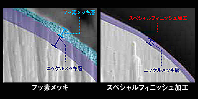 超極薄メッキに独自の滑り性を持ったスペシャルフィニッシュ加工を針表面に分子レベルで結合することができた。従来のメッキ層は3ミクロン前後だがスペシャルフィニッシュ加工はさらに薄い1.5ミクロンのメッキ層に分子結合した特殊皮膜を形成、従来より鋭い針先が実現可能になった新技術。