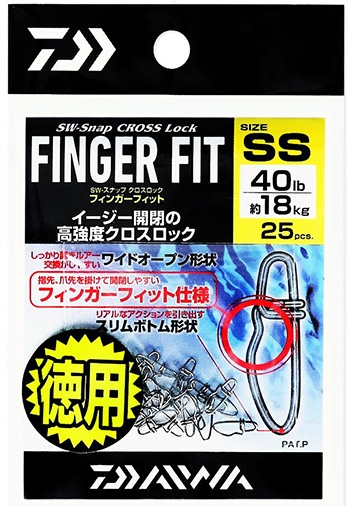シーバスや青物、ヒラメなどパワーがあるターゲットを対象にしたクロスロックスナップ。 太軸で頑丈なので安心なのだが、硬くて開閉しにくいデメリットもある。 『SWスナップ クロスロック フィンガーフィット』は開閉部分にクボミを付けたので、指先にしっかりハマって開閉しやすいクロスロックスナップだ。 指先が濡れていたり、かじかんでいる時でもルアー交換がイージーに行える。 破断強度も高く大物とのやり取りでも安心して使える。 スナップとルアーが密着した状態になるスリムボトム形状なので、キビキビとしたルアーアクションを引き出せる。