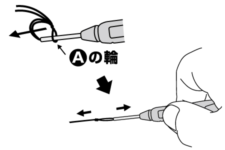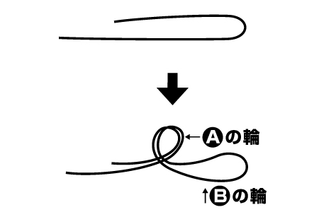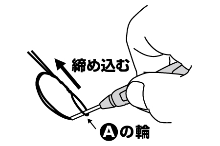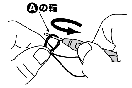 2)Aの輪に8の字結びのパイプを差し入れ必要に応じて2~5回ひねる。