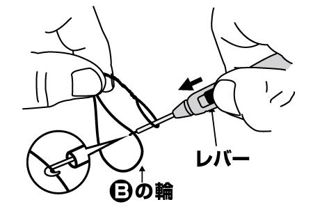 3)8の字結びのレバーを前方にスライドさせてフックを出し、Bの輪にかける。