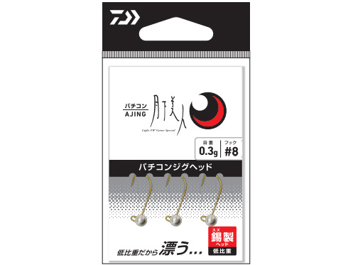 月下美人が提案するバチコンジグヘッドは「錫製」ヘッド。対「鉛」比重は150%と体積が非常に大きくシルエットが大きい故、「潮流の影響を受けやすく」「フォール速度が極めて遅い」。