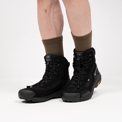 靴の中で足が滑る斜め護岸や大荒れの船釣りなどに最適。足裏のシリコングリップがしっかりと靴と密着し、ずれにくくするため、余計な力を使わない。ソックスは吸水性のある糸と抗菌防臭糸を採用。甲側は通気性のあるメッシュ構造で蒸れを軽減。土踏まず部分を着圧にすることで長時間の釣行でも疲れにくいよう、足をサポート。
