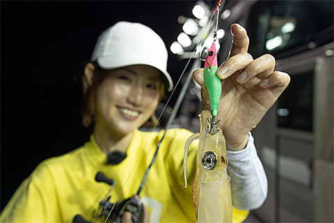 「メタルスッテとは真逆で、エギは種類が必要なんですよ。ステイしているのを、じっくりと見て、抱きますから。エギは当たり外れの差がものすごく出ます。そこはオバマリグの面白いところ。下のスッテは少ない色数をローテーション、上のエギはイカのお好みに沿うように、たくさんの種類を用意しておくべきだと思います」