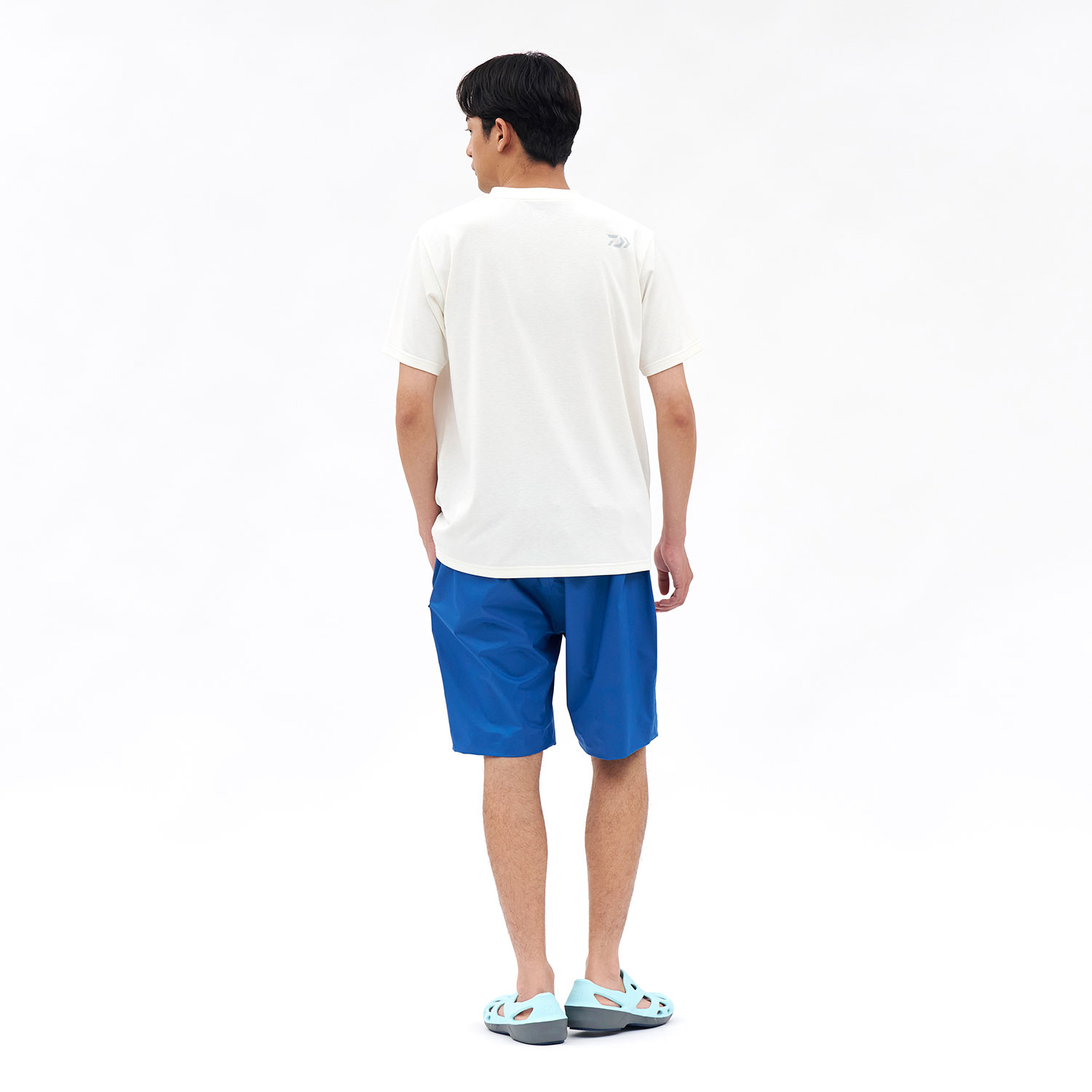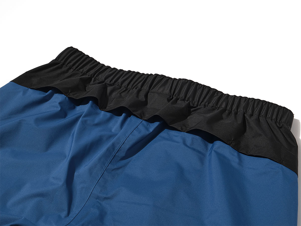 裾からの水の吸い上げが起きにくい2.5層生地で快適に着用可能。生地裏面は凹凸状になっているため、肌離れしやすい。パンツウエスト部はバックル付き調整ベルトでずり落ちにくく、動きやすい。腰裏のベンチレーションで蒸れを逃がし、暑い日にも快適に着用可能。