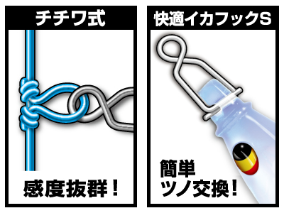 感度に優れるチチワ式。イカフックを外してエダスを接続すればブランコ仕掛けに変更可能。