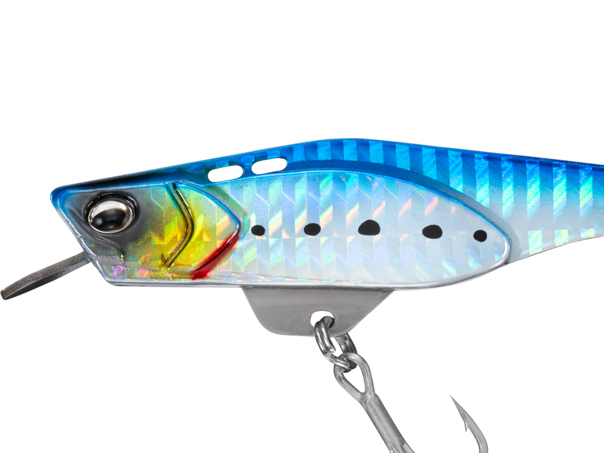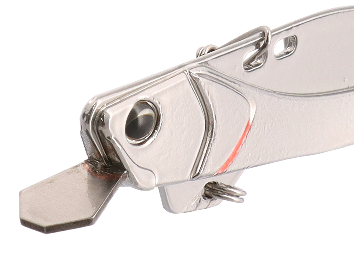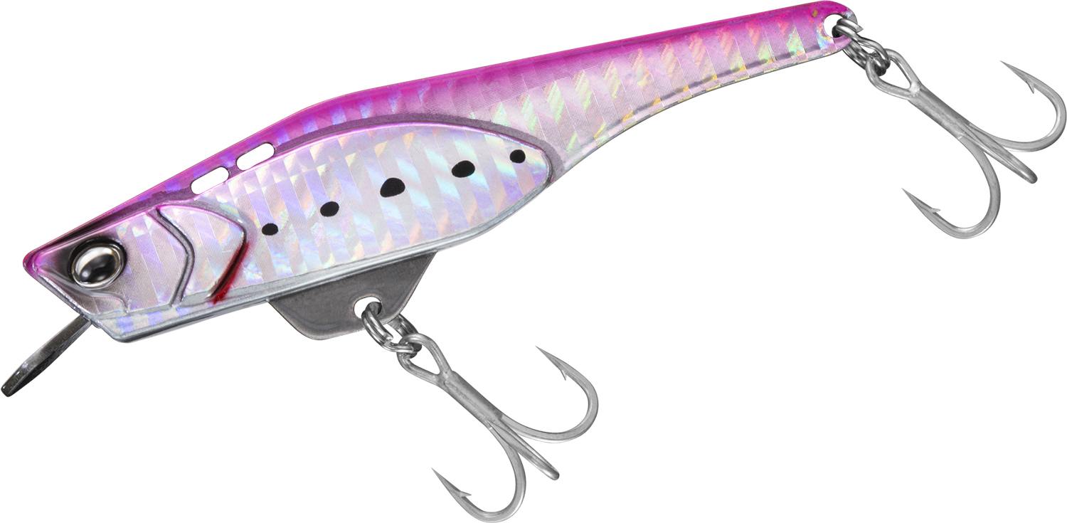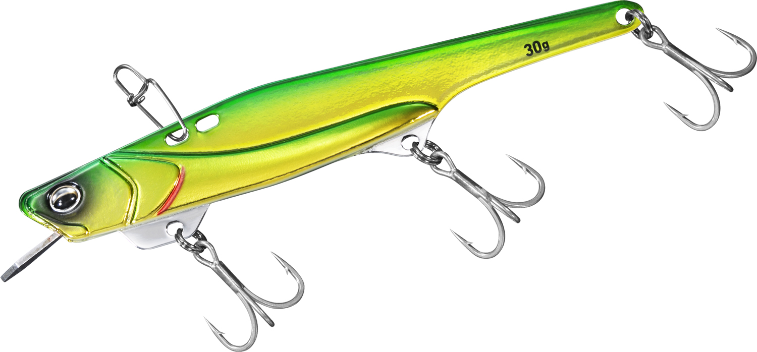 ステンレスリップのニューオリジナルデザイン、今までにないミノーライクな鉄板系。樹脂製ヘビーミノーより細身でシルエットが小さく、ベイトが小さい時やセレクティブなときにも対応可能。魚の活性やレンジに合わせて、アクションの使いわけが出来るダブルラインアイ設定。