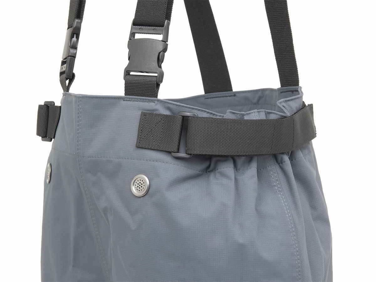 肩ベルトのバックルは、左右で上下をあえて逆に設計。小用時には左右のバックルをつなぎ首に掛けることで、肩ベルトが背中側に逃げにくくなり、わずらわしさを解消。実釣での快適性を細部まで追求。