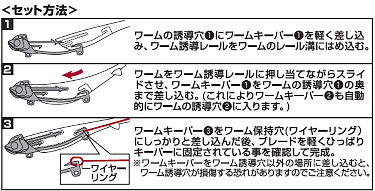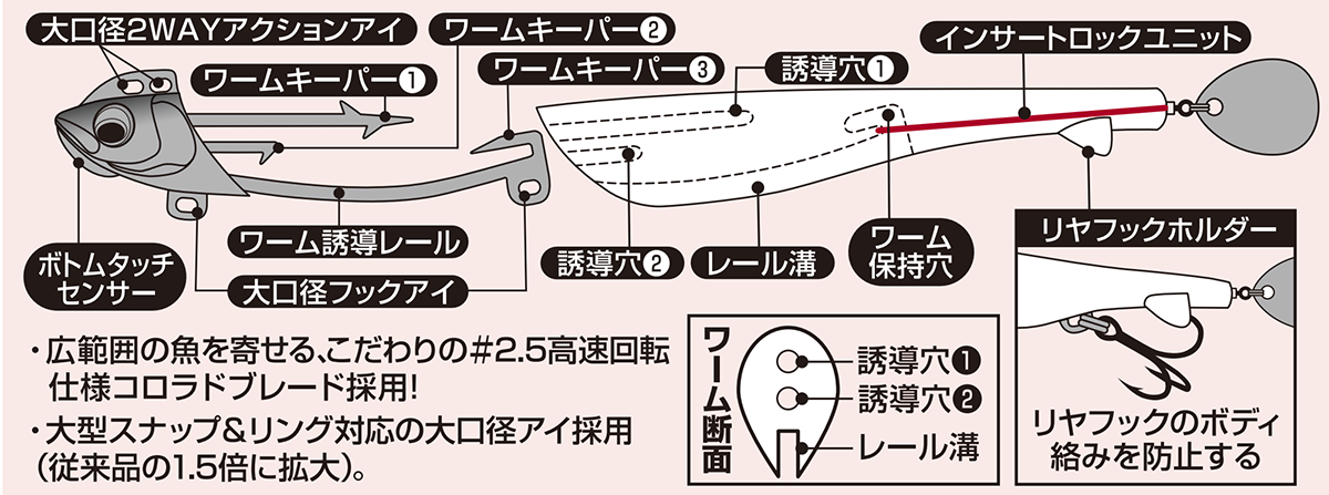 誘導穴・誘導溝つきワームボディ採用によりワンタッチでボディ交換可能。