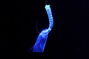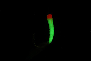 ■針のフトコロに夜光塗料を塗った後にソフトアミエビ ホワイトを巻いた擬餌写真(UV照射時)