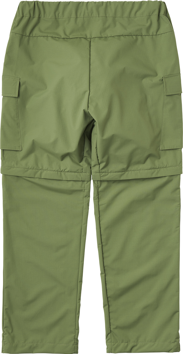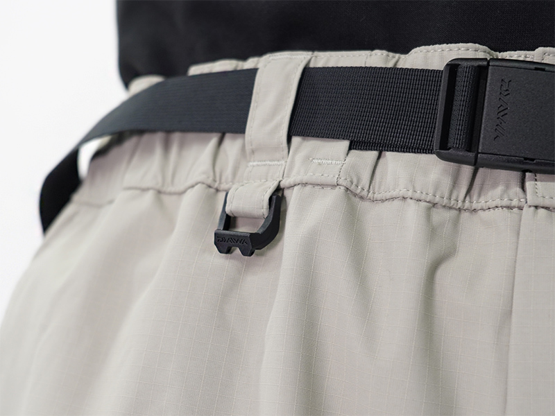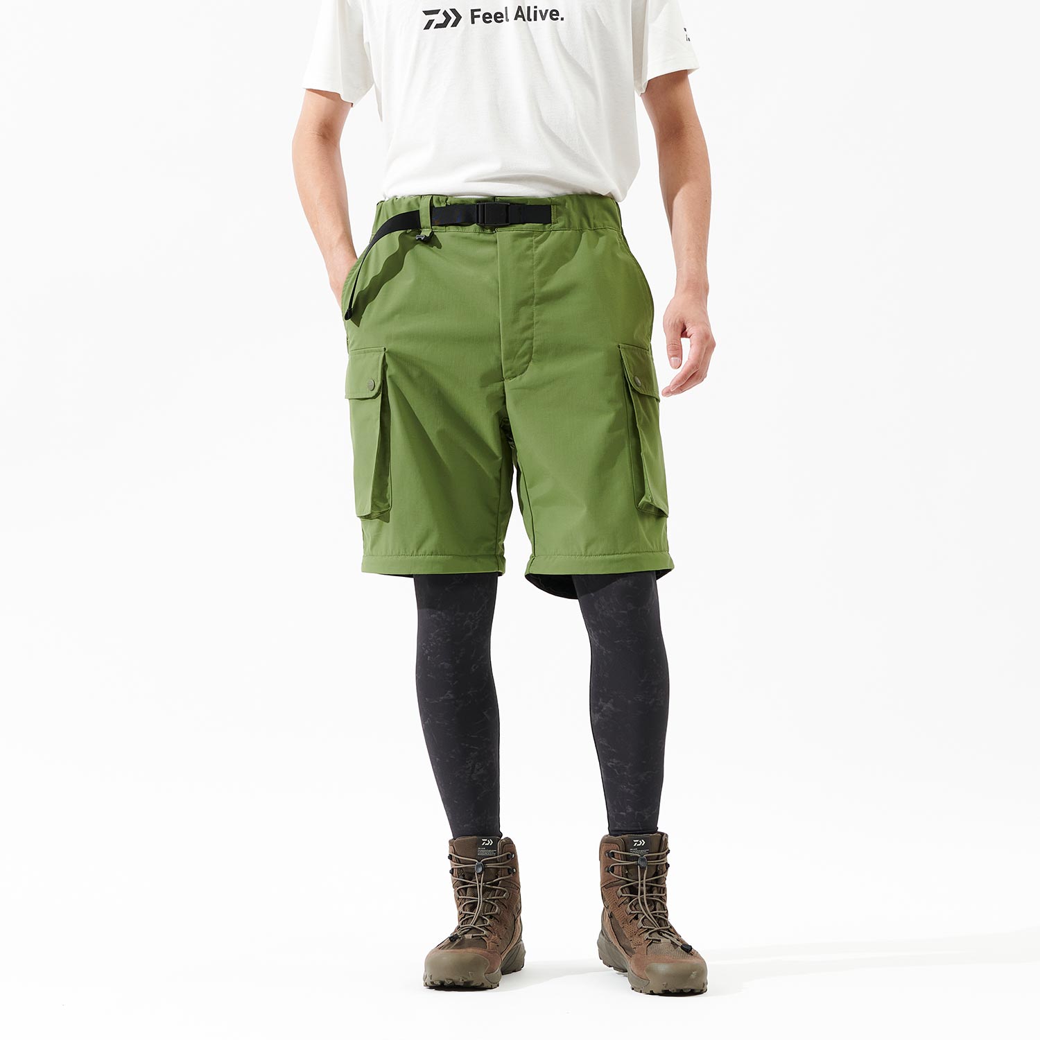 ロングパンツにもハーフパンツにもなる便利アイテム。生地はレイン素材なので朝露等がある場合でも染み込まず便利。暑い時期には、裾を外し、ハーフパンツとして着用可能。フロントには、ピンオンリールホルダー付き。ウエストにはバックル付き調整ベルトを搭載し、素早くフィット可能。大型ポケットはマチ付きでルアーケースが入りやすい仕様。