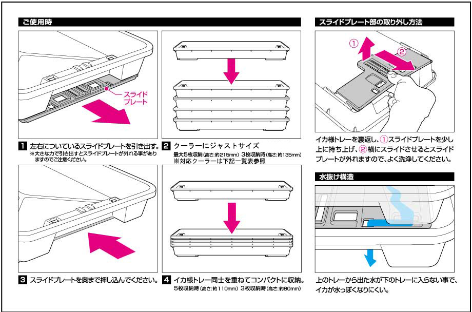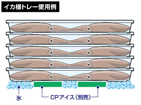樹脂素材採用でトレーが一度冷えたら温まりにくく、イカを鮮度を保ち、キレイに持ち帰り