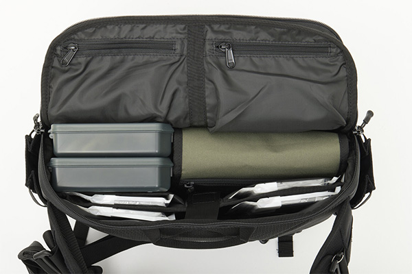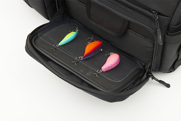 ひんぱんに使用するルアーを収納し取り出しラクラク、ルアーマット付きフロントポケット。