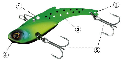 ボディ前方下部にタングステン球をマウント。安定フォールに加え、この高硬度タングステン球がボトムに最初に接触することで、アングラーの着底感知力が向上。メタルバイブの泣き所ともいえる「根掛かり多発」を軽減することができる。