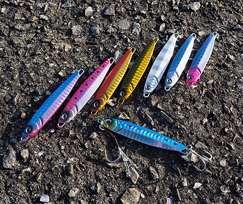 まずめ時や曇りや雨のローライトの時に有効なのが夜光塗料をまとったカラー。イナダをはじめ、サワラやタチウオに特に有効で、こればかりにヒットが集中するときも多い。