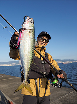 新しくなったサムライジグRは旧モデルと比べて飛行姿勢がさらに安定してより遠くへ飛ばす事ができます。アクションも、ボディがスリムになったことで暴れにくくなった印象を受けました。それとアシストフックが旧モデルより短くなったことでラインがフックに絡まりにくくなってより快適に釣りを続けられますし、アクションの入力も気を遣うことなく操作できるようになりました。また、リアのトレブルフックが強化されているのでパワーのあるさらに大きな青物などに対応できるようになったのも嬉しいポイントです。堤防、サーフ、磯など、いろんなフィールドで使いやすいジグです。基本的な使い方としては、ジグを底まで着底させたら、ロッドを1回シャクる間にリールのハンドルを1回転巻くワンピッチジャークで誘い上げて、フォールさせるのが基本的な操作となります。それでも反応がなければジャークのスピードを速めたり、緩めたりして誘うのも効果的です。それとサムライジグRはただ巻きでもしっかりアクションしてくれるので、ただ巻きで誘うのも使い方の一つです。ただ巻きばかりに反応する日もありますので、ぜひ、試してみてください。