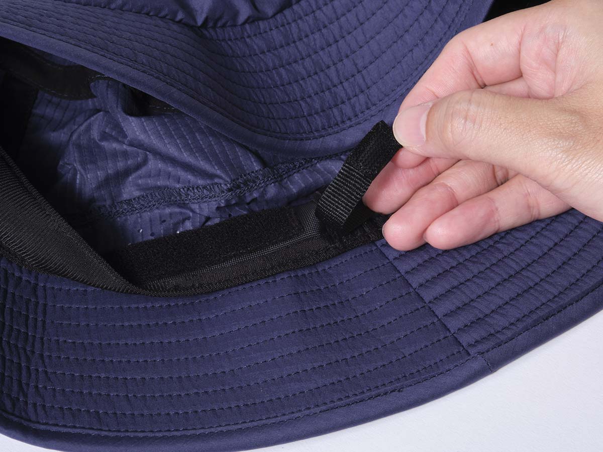 より快適なバランスを保つために表面と裏面を異なる密度の生地での二層構造にして、風は通しにくく蒸れを逃しやすい。サイズはすべり裏のテープで調節可能。