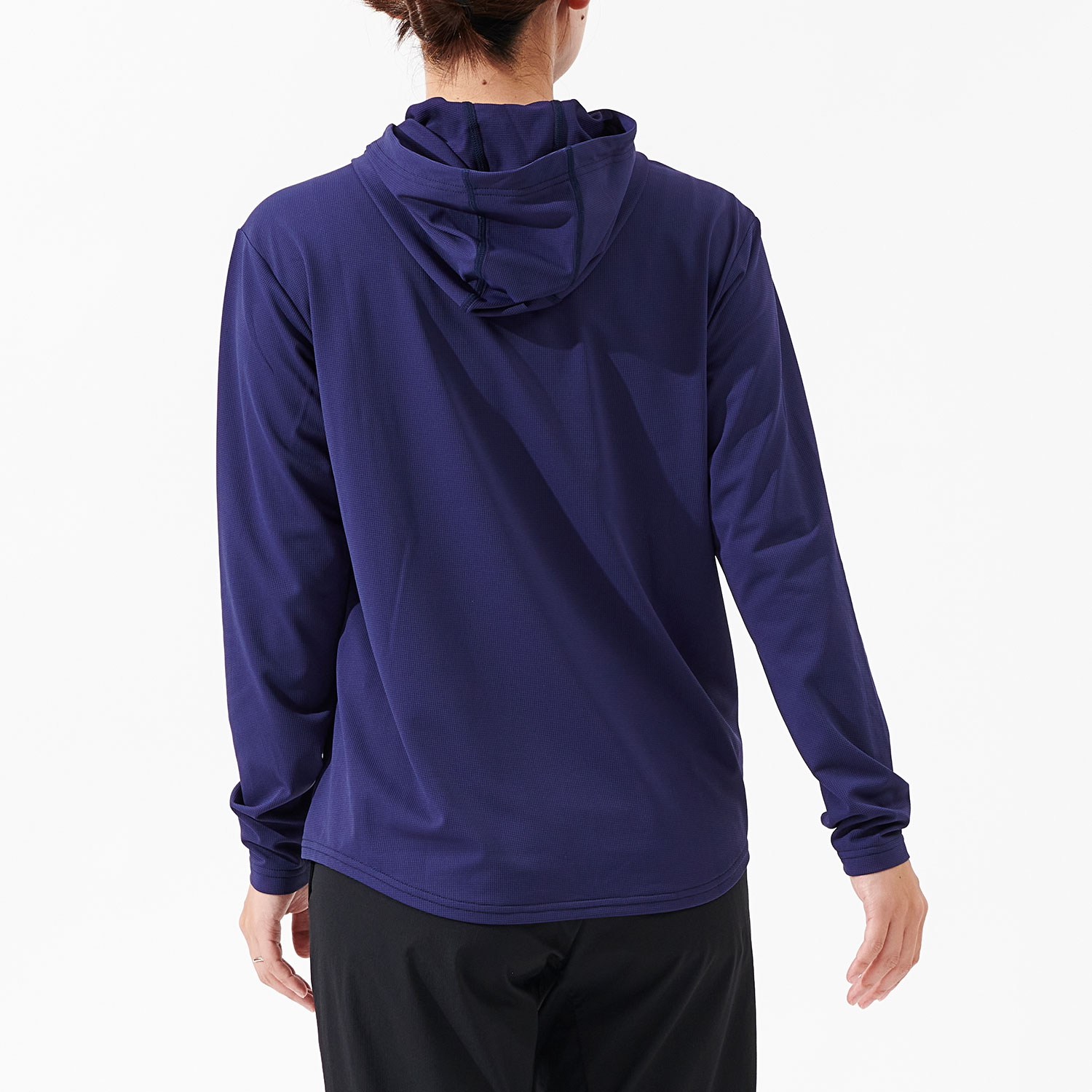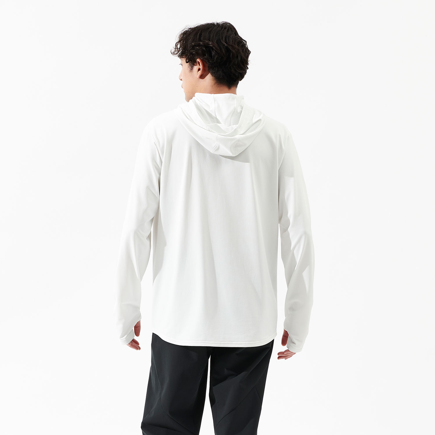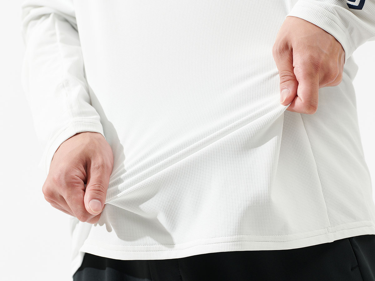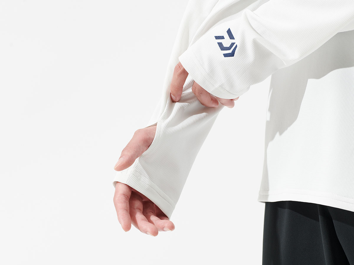 袖丈は若干長めに設定し、袖口にはフィンガーホールを設け、手首周りに生じがちな隙間の日焼けを予防。