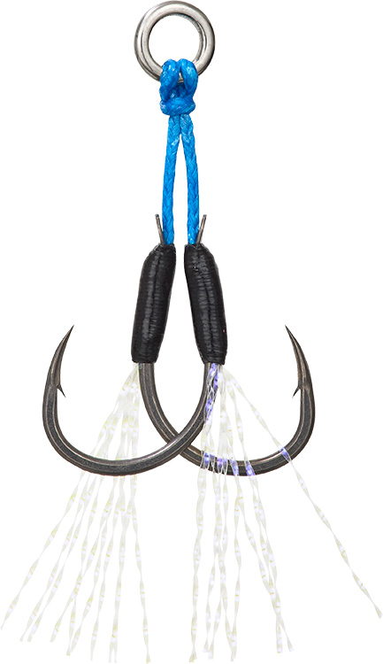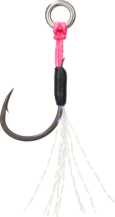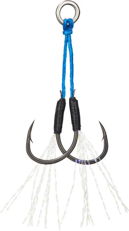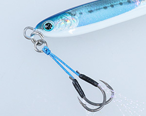 アシストラインにはフロロカーボンを入れることで張りを出し、ジグに絡みにくく、それによりフッキング率がアップします。 リアのアシスト長にも拘ることで、フロントとリアが当たらないようにジグのサイズに合わせた長さにしています。 更にノーマルと太軸でカラーを分けることで、わかりやすく使い分けができるようにしています。