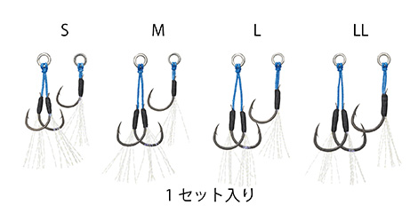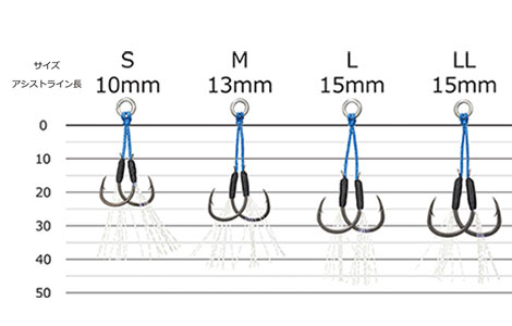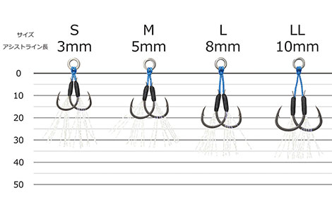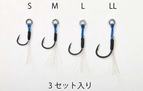 SLJにおいて様々なサイズのジグを使いますが、ジグサイズに合わせて針の大きさを選べるように豊富なラインアップを揃えました。