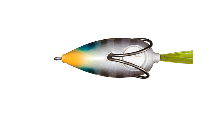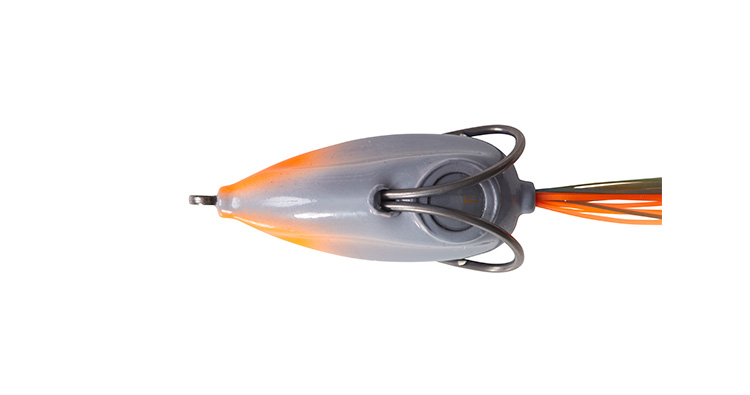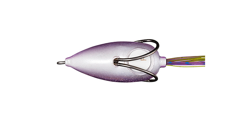 その結果生まれたのが低浮力という新しい構造を持ったSTEEZ SNAPPY FROG。低浮力はそれだけで吸い込みもいいというメリットがあり、水中での勝負なので風にも強い。ノーマルだと5cm程度のサブサーフェスを泳ぐが、自分で水を入れればバックスライド気味に沈んでいくし、50~60cmまでのレンジを選んで引ける。先端が尖っているのでカバーのすり抜けも良く、シングルスカートがクイックな動きを演じてくれる。抵抗の少ないシングルスカートのなびき方も綺麗で、シャッドっぽく見せることもできる新しいフロッグのカタチだ。