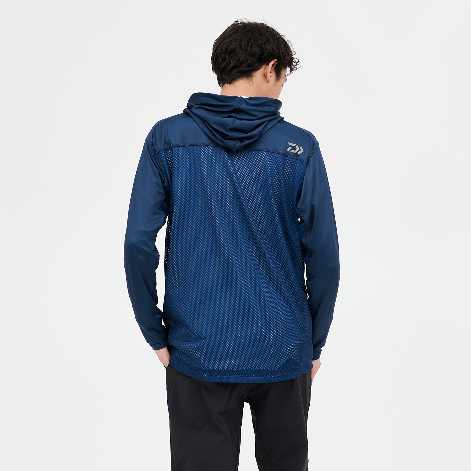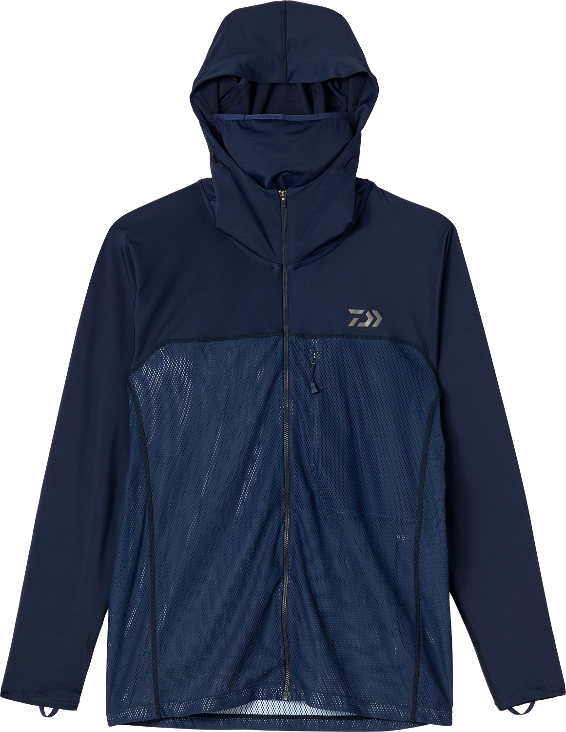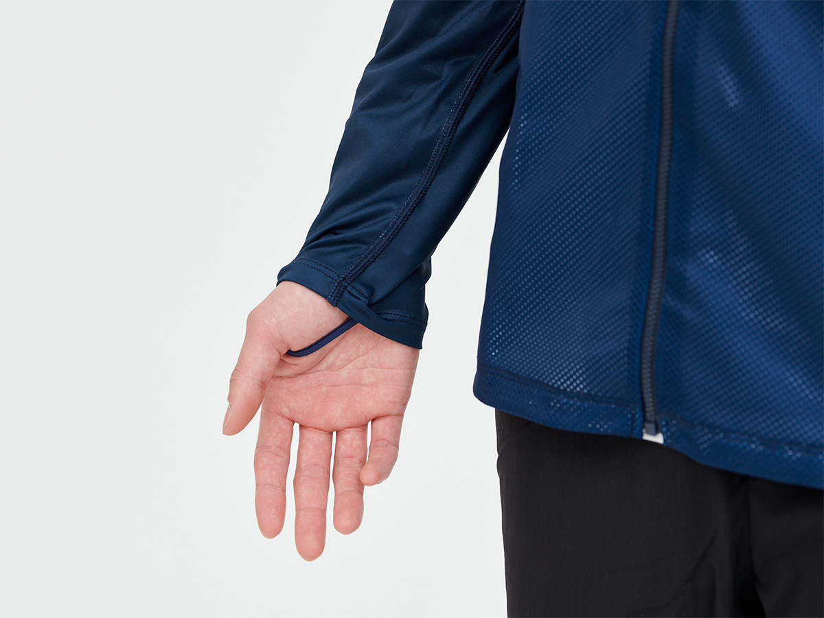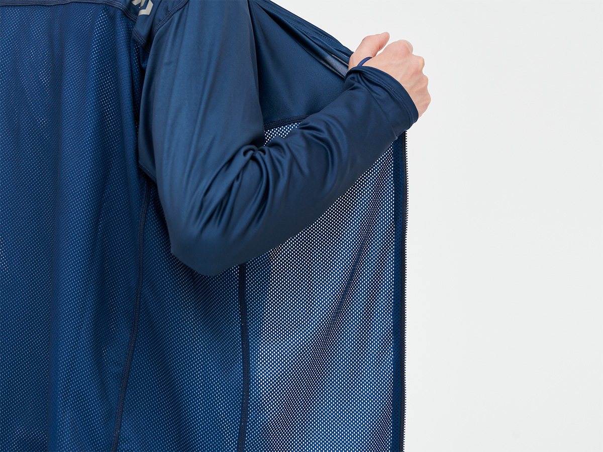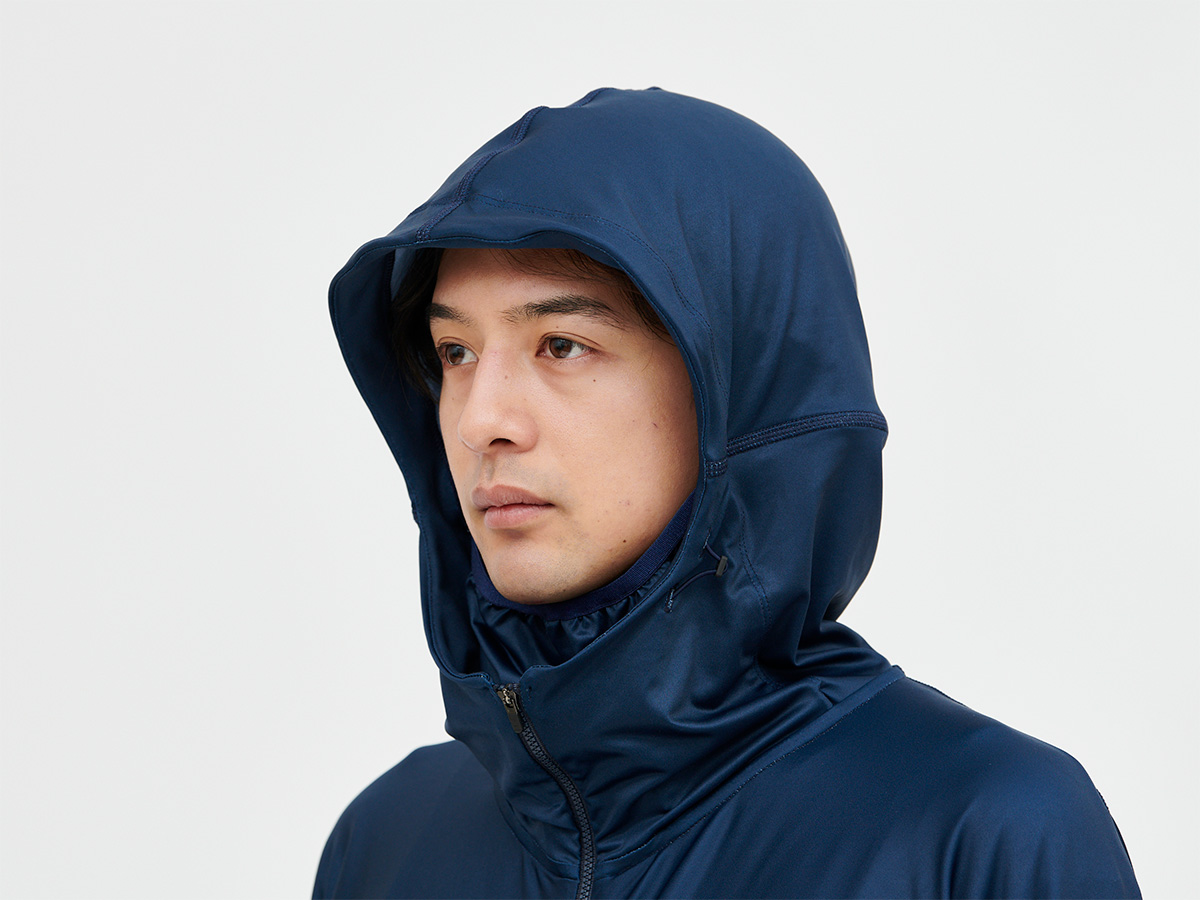 太陽に晒されやすいフード、フェイス、腕部にはUVカット(UPF50+)、吸水速乾、接触冷感、遮熱機能のあるICEDRY®素材を採用。
