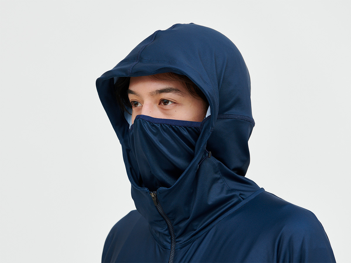 フード後ろにフェイスカバーが付いており、必要時のみ使用することが可能。