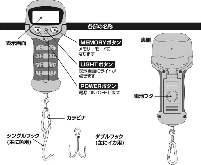 魚はもちろん、イカが測定できる交換フック付き。
