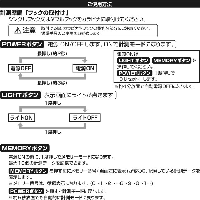 データを10個までメモリー可能で、最大25kgまで測定できます。電源は単4形アルカリ乾電池2本(別売)で、本体重量は約105g(電池別)です。