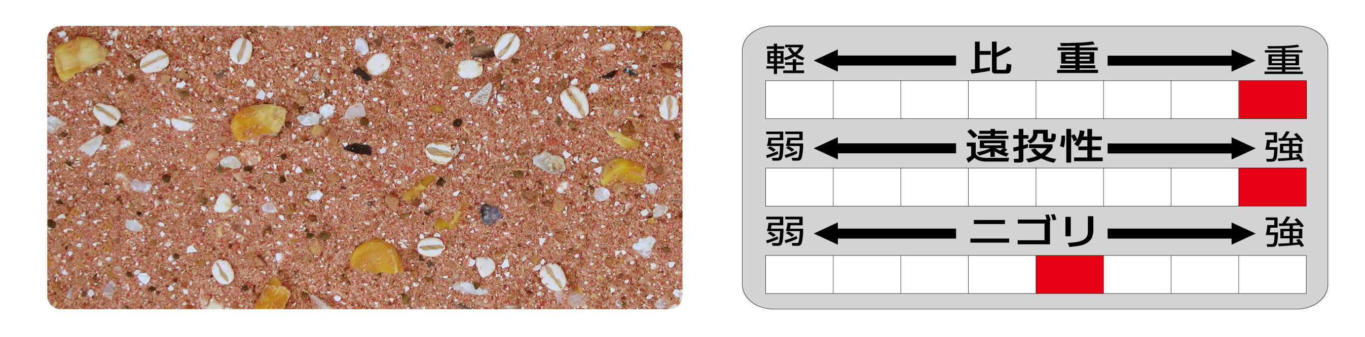 集魚効果抜群の旨み成分がたっぷり入った「アミノX」を配合。鹿児島大と取り組んで開発したアミノ酸豊富な素材『アミノX』。旨さで寄せる。