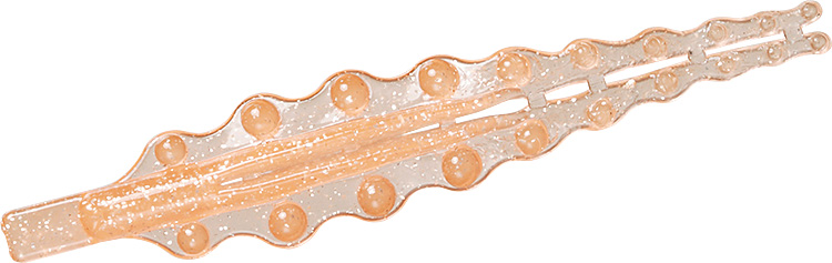 テール部分を二つに引き裂けば、より波動の大きな艶めかしいアクションを発生させる。ベイトの小イカをイメージさせるようなイボ付き。ネクタイとくっつきににくく、フックの絡みを軽減する効果も。