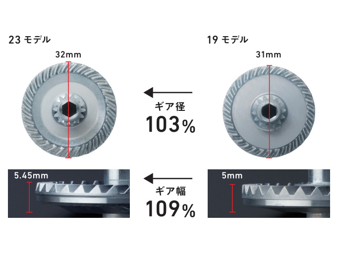 更に、「回転耐久性の向上」。ギアの大口径化で回転耐久性能も向上した。