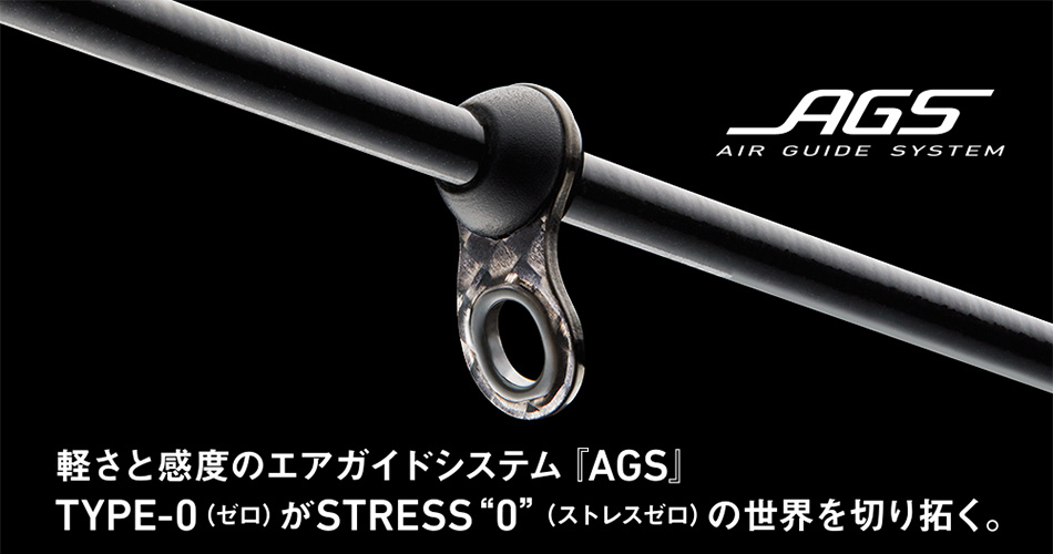 カーボンフレームに高強度セラミック製Nリングを搭載し、これまでにない軽さ、感度をもたらせた『AGS』。穂先も軽くなり繊細なライン操作が可能に、またガイドフレームを前傾タイプにすることで糸絡みを大幅に軽減させた。さらに0(ゼロ)形状ガイドリングにより投影面積を拡大し、ライン放出性能を最大約150%向上させたのが『AGS』TYPE-0(ゼロ)。ワンランク上のラインコントロールが実現した。