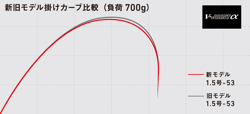 一定負荷において穂先はこの位置だが、さらに負荷が増すと、V-JOINTαの効果でスムーズに節が張りすぎることなく曲がりこみ、急激な魚の引きに追従する調子となっている。