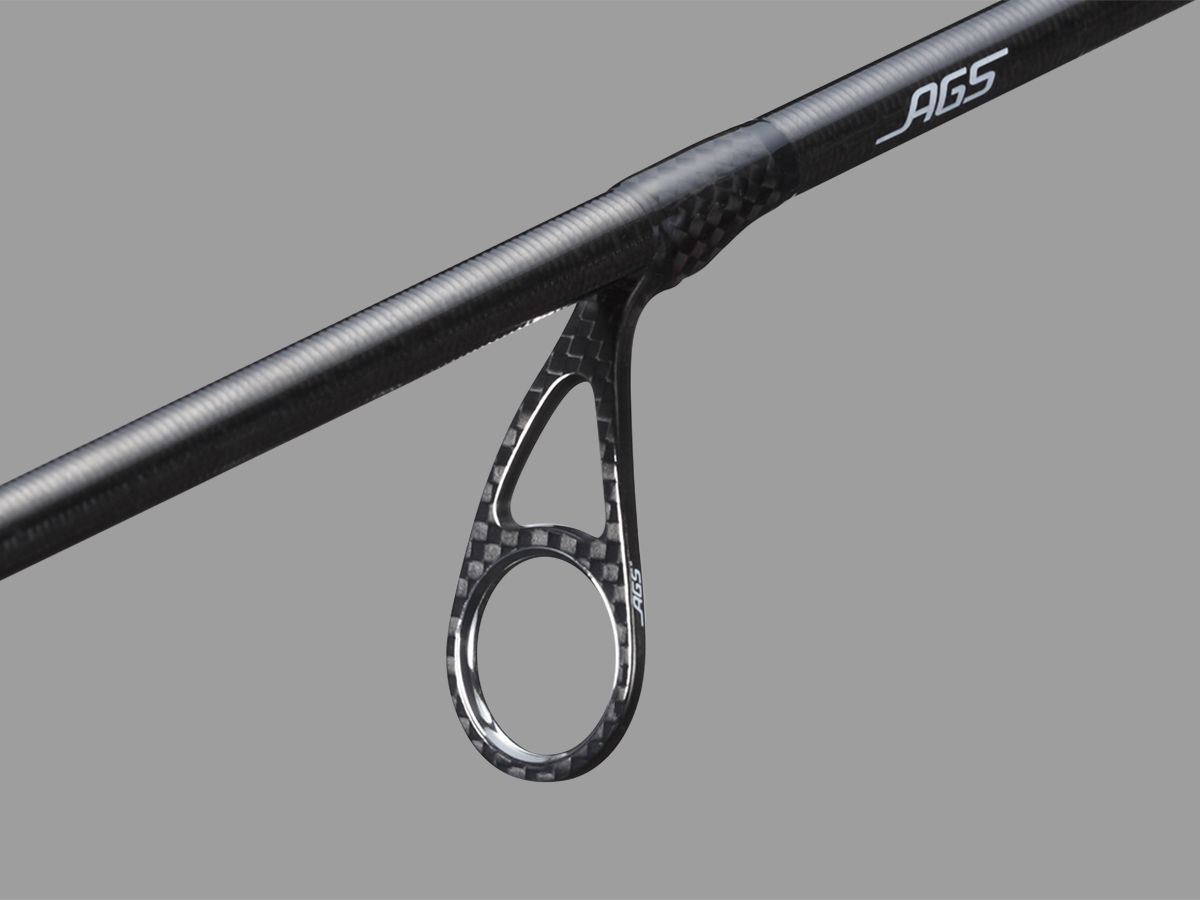 軽量・高感度を実現するAGS(エアガイドシステム)はカーボンフレームを採用しており、チタンと比較して約3倍の剛性をもつカーボンの特性から、ラインを通して伝わるわずかな信号を吸収することなくダイレクトにブランクに伝える高感度を有します。また、カーボンの軽量性によりスイングスピードの向上とティップのブレの収束の速さにより、飛距離とコントロール性能が大幅に向上します。