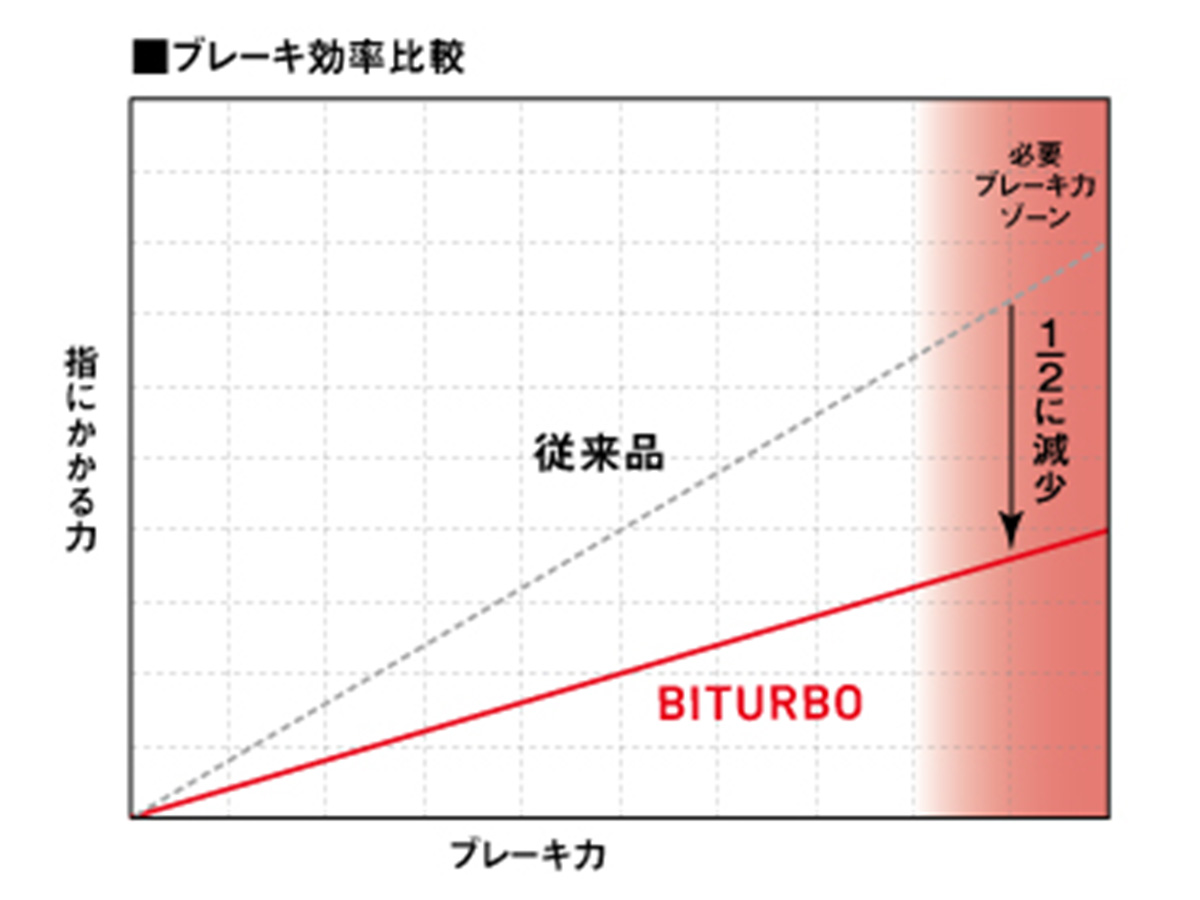 『BITURBOブレーキ』は、従来品と比較し、同じブレーキ力を発揮させるのに必要な指の力は半分でよい。つまり、指にかかる力が同じであれば、生み出される力(ブレーキ効率)は、従来品の2倍に相当する。
