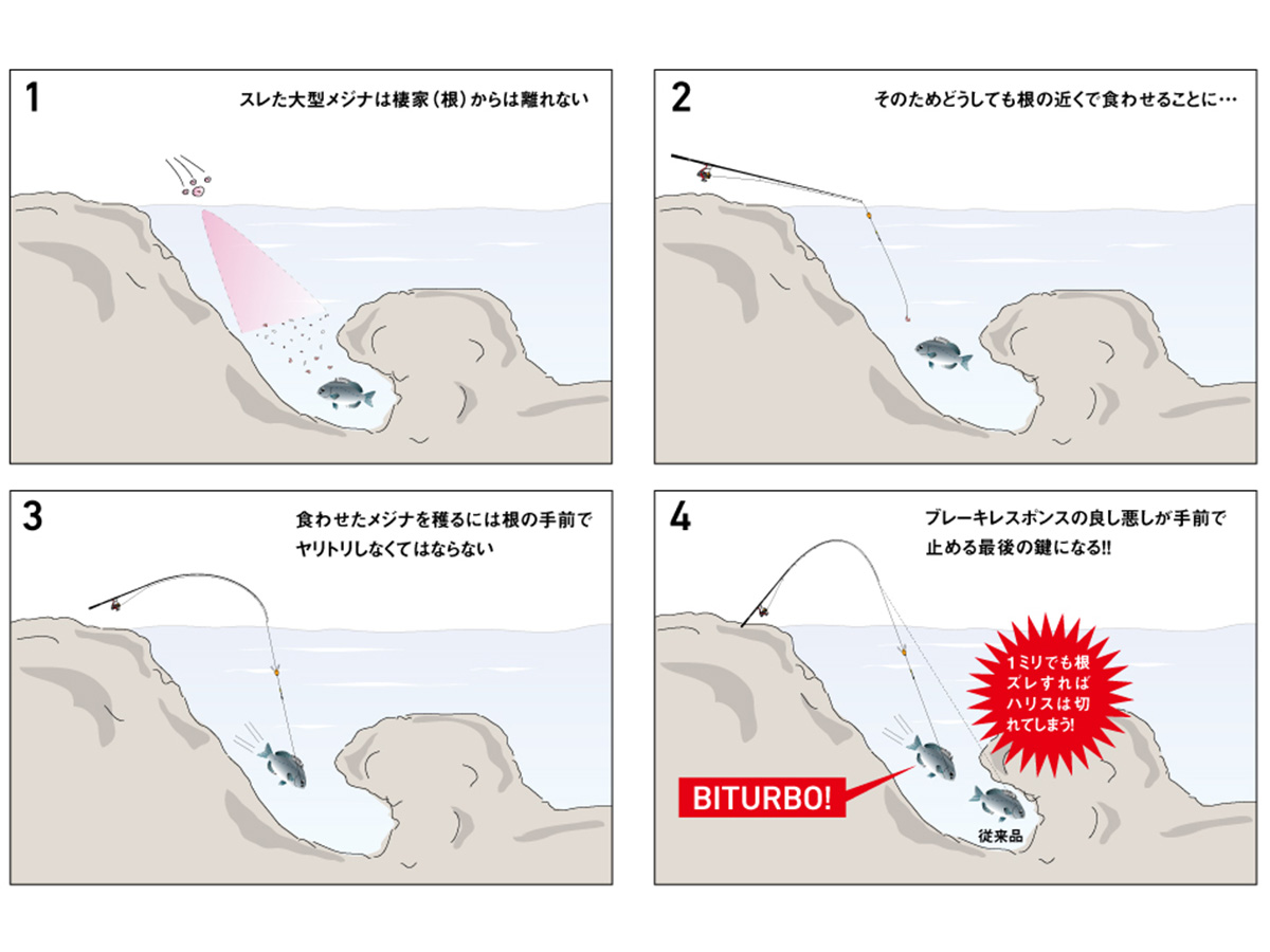 ラインを送り出す動作は“守り”であり、豊富な巻糸量は“保険”と考えることができます。しかし、ただ守るばかりでは魚は獲れません。特に大型魚が相手だと、ちょっとした隙を与えたばかりに手痛い反撃を食らうことになります。BITURBOブレーキの強力な制動力は、守りから瞬時に攻めの体制を作り、ロッドワークに集中することができます。