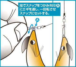スナップ部を持ち、装着部にエギのアイを入れて1回転ひねるだけで脱着出来る簡単スナップ、釣場で簡単にお使いいただけます。