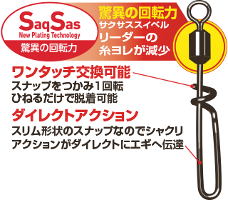 スナップ部はスリム形状なのでロッドアクションがエギにダイレクトに伝達。またスイベル部はサクサス加工なのでリーダートラブルが激減。
