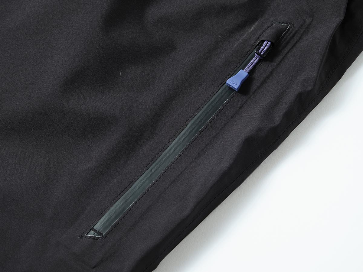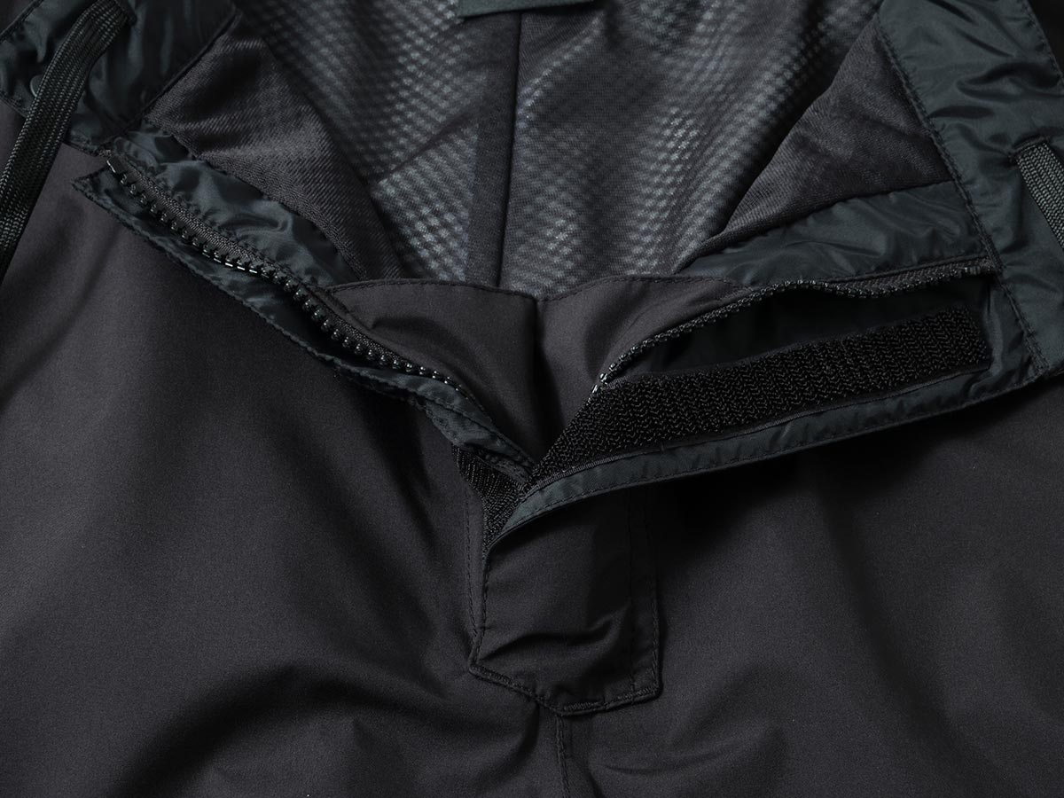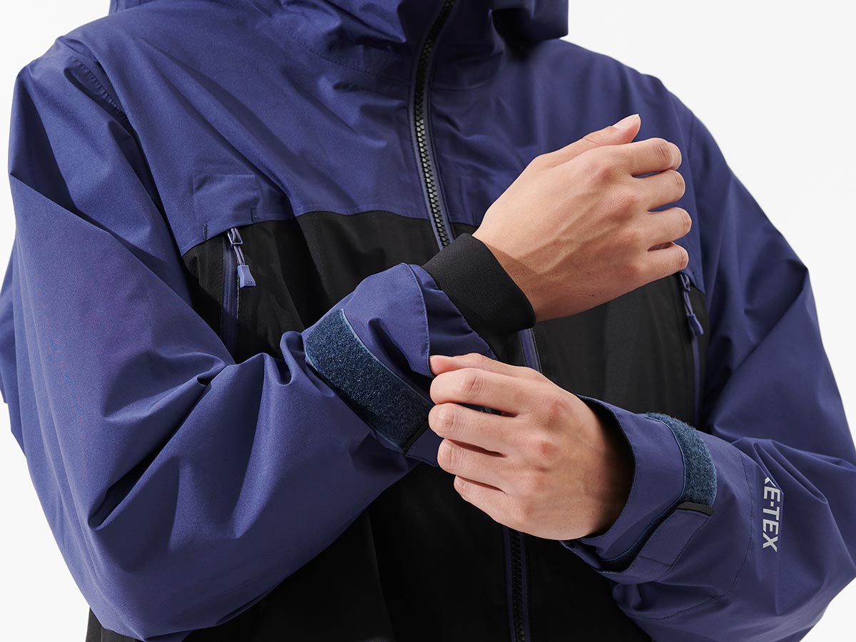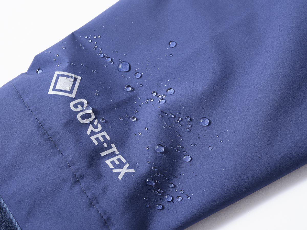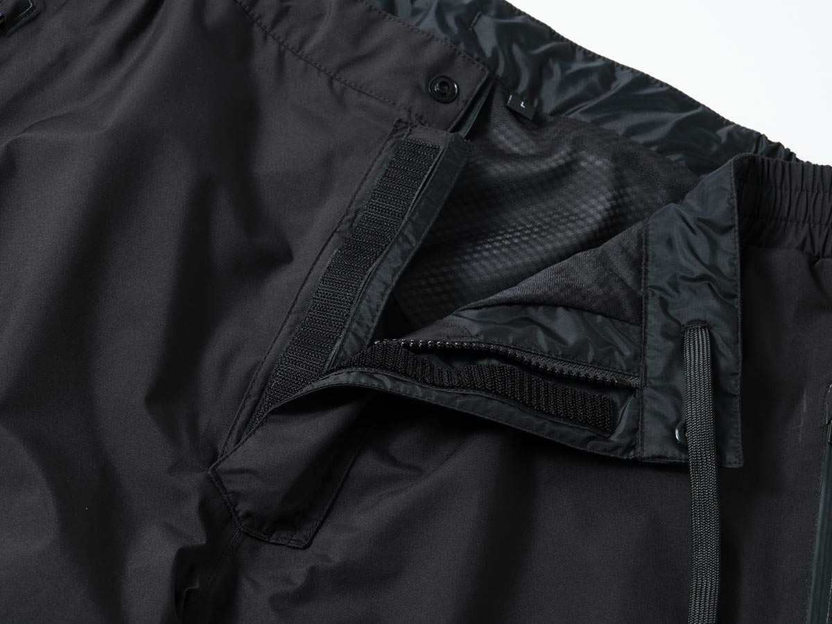 優れた防水性、防風性、透湿性を有する2層構造のGORE-TEX生地を採用することで、柔らかくしなやかな着心地。裏地にメッシュを配した二重構造とすることで、肌離れがよく、雨を肌で感じにくくなり、肌寒い時にも快適に着用可能。環境負荷の少ないフッ素フリー撥水剤を使用したモデル。フロントとポケットには止水ファスナーを採用し、防水性を重視。袖口から水の浸入を軽減する二重袖口採用。パンツポケットにも止水ファスナーを採用。裾にはベルクロを配し、絞り込むことが可能。