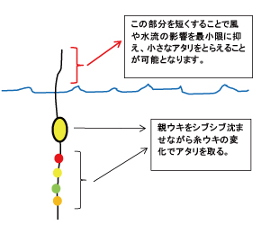 タナゴの数釣りというと足下のポイントを探る釣りが中心となります。ウキバランスがゼロ~ゆっくりマイナスの状態でより繊細なアタリを取るためには竿先と水面との差が小さい方が優位。(糸フケが少ない方が風や水流でウキが引っ張られない)つまり、足場の高さと狙う水深によって細かな竿の使い分けが必要になってくる。