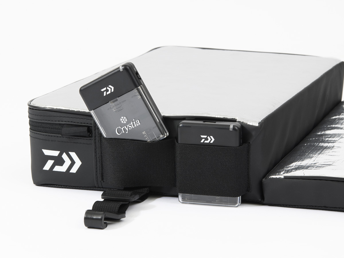 長物のタックルが多いワカサギ釣りに便利な、VSタックルバッグ(A)に取り付け可能なフックパーツ付き。移動時にタックルバッグの上からクッションが落ちるのを防止する。