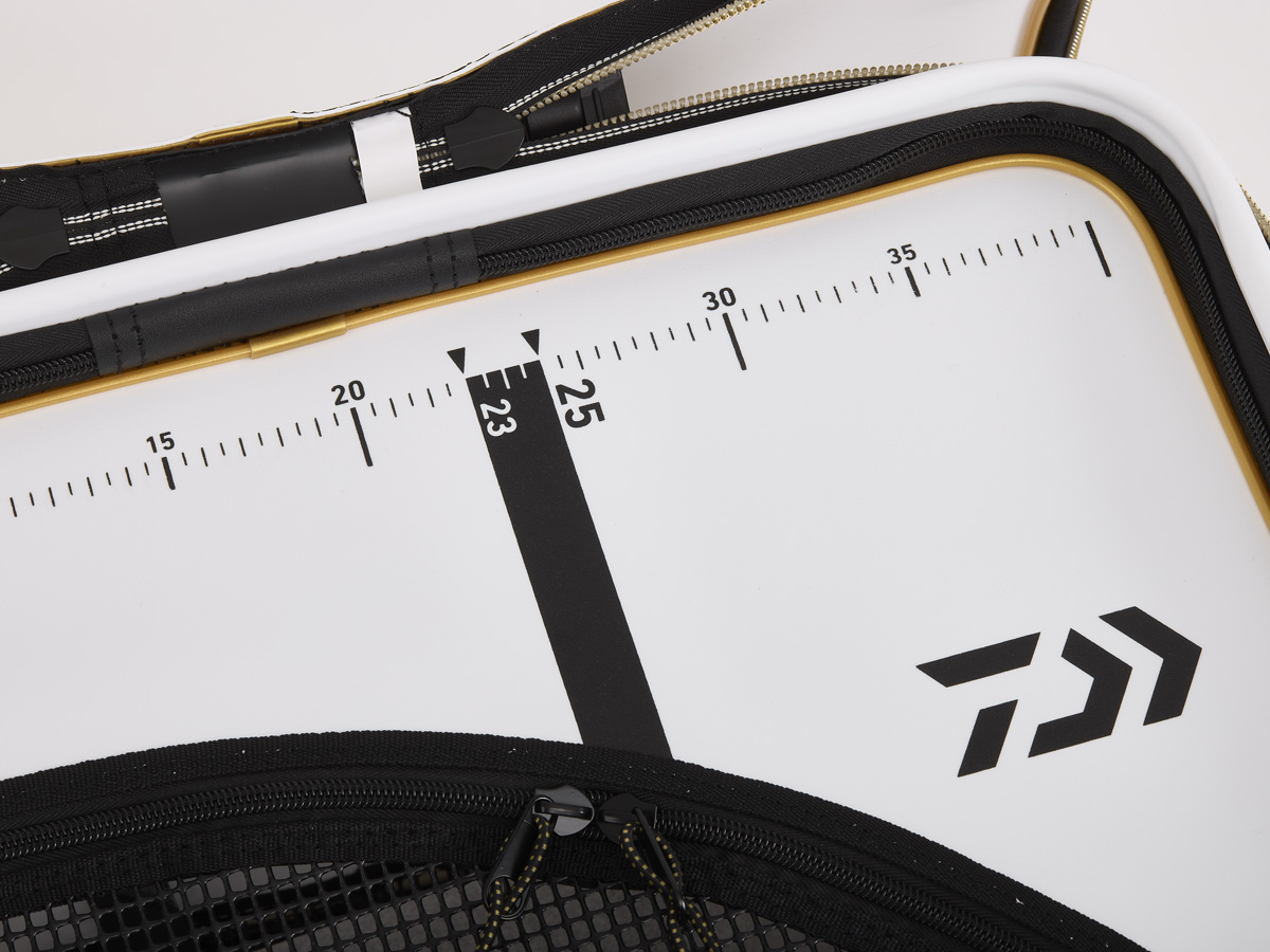 魚の入れやすさと魚の飛び出しにくさを両立したラウンド形状。さらに、変則にラウンドさせることでメジャーシート部分に張りを持たせることができ計測しやすくなった。