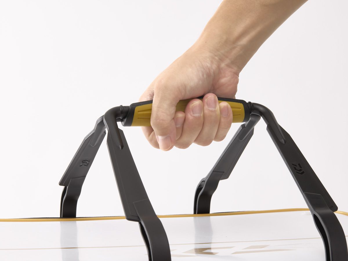 ■2種類の材質を適所に採用した合体ハンドル。メイン部(黒色)には重い荷物でも安定して持てる硬い素材、握る部分(黄色)にはグリップ性のある素材を採用。
