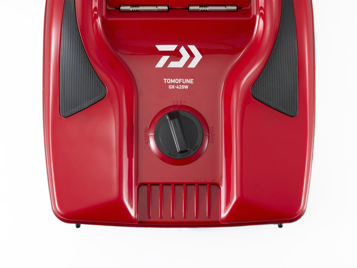 後部の排水口から水が出るので、舟内の水が循環し、高水温で舟内の鮎が弱るのを抑えられる。また、水温に合わせて水量調整ダイアルで排水量を調整可能。