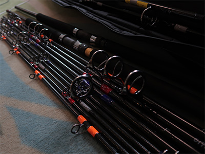 ブランクス、グリップ、ガイドセッティング……すべてをゼロベースで開発。丸二年の歳月を要した。一本のロッドを作るために、いったい何本試作し、何回の釣行を繰り返しただろうか。結果、二つの開発コンセプトを実現するためにたどり着いた基本設計が、印籠と並継ぎを組み合わせた3ピースという複雑な設計手法だ。#1と#2を印籠構造にすることで、荷重移動がスムーズになり、艶めかしく切れのあるルアーアクションを実現する穂先、極自然に、意のままにプラグやジグを操作できるベリーが完成した。一方、#2と#3は並み継ぎ構造を採用。元節を太くすることで強靭なパワーを備えた。これにより、遠投性と強いリフトパワーを実現。操作性とパワーの相反する要素を高次元で両立することに成功した。一回の釣行に持ち込んだサンプルの一例がこの写真。これを何回も繰り返し、テスターと共に細かなところまで理想を追求した。